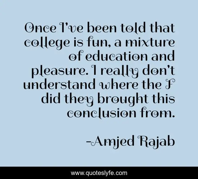 This page presents the quote "Once I've been told that college is fun, a mixture of education and pleasure. I really don't understand where the F did they brought this conclusion from.". Author of this quote is Amjed Rajab. .