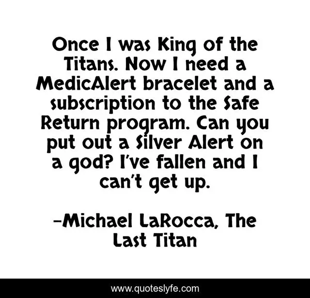 This page presents the quote "Once I was King of the Titans. Now I need a MedicAlert bracelet and a subscription to the Safe Return program. Can you put out a Silver Alert on a god? I’ve fallen and I can’t get up.". Author of this quote is Michael LaRocca, The Last Titan. This quote is about gods, novel, fiction,.