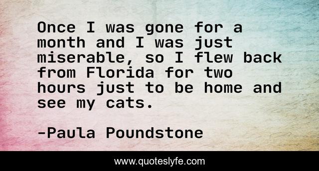 This page presents the quote "Once I was gone for a month and I was just miserable, so I flew back from Florida for two hours just to be home and see my cats.". Author of this quote is Paula Poundstone. This quote is about see, cats, back,.