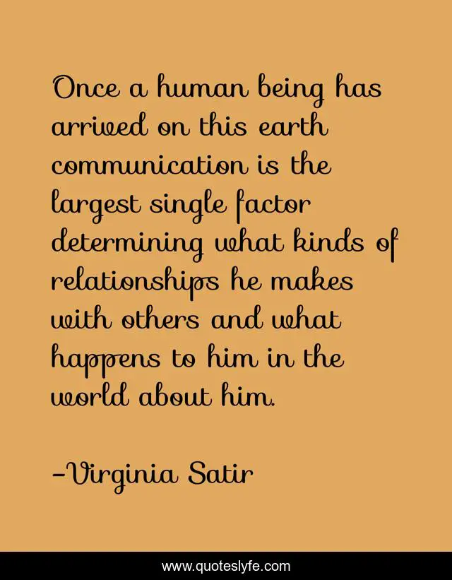 This page presents the quote "Once a human being has arrived on this earth communication is the largest single factor determining what kinds of relationships he makes with others and what happens to him in the world about him.". Author of this quote is Virginia Satir. This quote is about positive, confidence,.