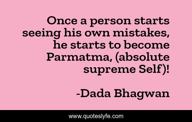 This page presents the quote "Once a person starts seeing his own mistakes, he starts to become Parmatma, (absolute supreme Self)!". Author of this quote is Dada Bhagwan. This quote is about spiritual, god, self, soul, knowledge-of-the-self, supreme-soul, knowledge-of-self, self-realization, self-realisation,.