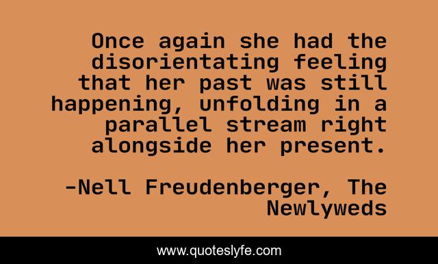 This page presents the quote "Once again she had the disorientating feeling that her past was still happening, unfolding in a parallel stream right alongside her present.". Author of this quote is Nell Freudenberger, The Newlyweds. This quote is about past, present,.