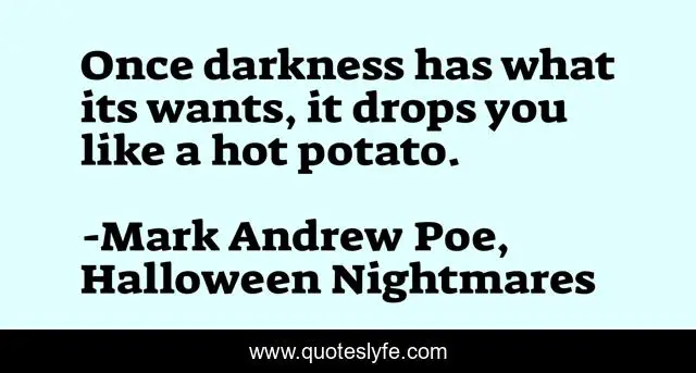 This page presents the quote "Once darkness has what its wants, it drops you like a hot potato.". Author of this quote is Mark Andrew Poe, Halloween Nightmares. This quote is about spiritual-warfare, darkness, harry-moon, demons,.