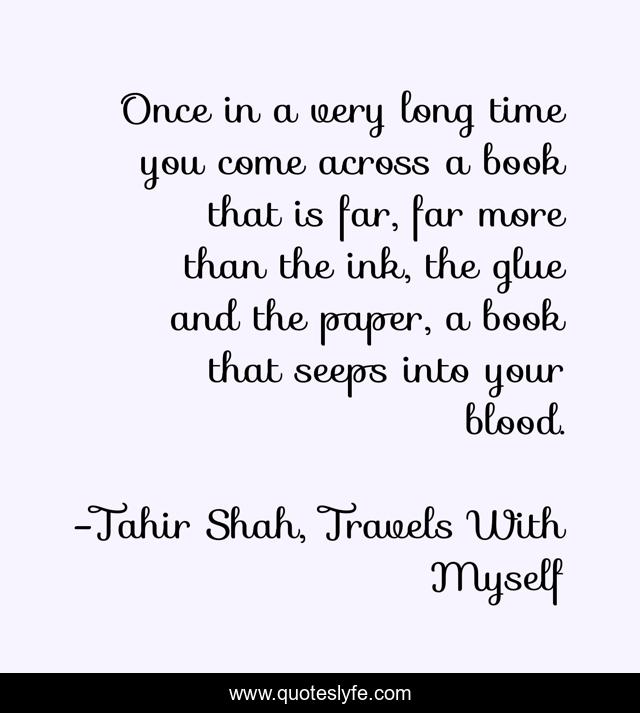 This page presents the quote "Once in a very long time you come across a book that is far, far more than the ink, the glue and the paper, a book that seeps into your blood.". Author of this quote is Tahir Shah, Travels With Myself. This quote is about book, reading,.