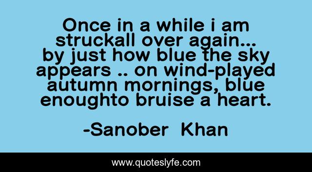 This page presents the quote "Once in a while i am struckall over again... by just how blue the sky appears .. on wind-played autumn mornings, blue enoughto bruise a heart.". Author of this quote is Sanober Khan. This quote is about nature, bruise, indian-authors, poetry, autumn, poems,.
