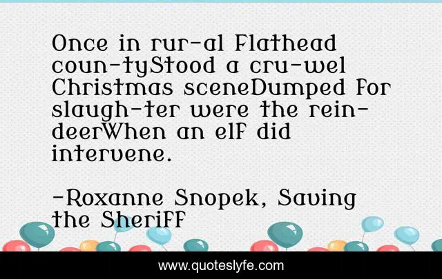 This page presents the quote "Once in rur-al Flathead coun-tyStood a cru-wel Christmas sceneDumped for slaugh-ter were the rein-deerWhen an elf did intervene.". Author of this quote is Roxanne Snopek, Saving the Sheriff. This quote is about contemporary-romance, holiday-romance, western-romance, christmas-romance,.