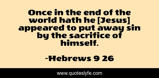 This page presents the quote "Once in the end of the world hath he [Jesus] appeared to put away sin by the sacrifice of himself.". Author of this quote is Hebrews 9 26. This quote is about prophecy, bible, end-times,.