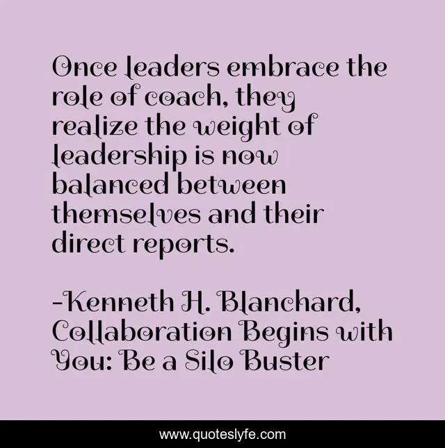 This page presents the quote "Once leaders embrace the role of coach, they realize the weight of leadership is now balanced between themselves and their direct reports.". Author of this quote is Kenneth H. Blanchard, Collaboration Begins with You: Be a Silo Buster. This quote is about coach, leaders, collaboration, leadership, teamwork, balance,.