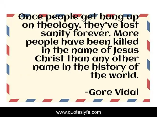 This page presents the quote "Once people get hung up on theology, they've lost sanity forever. More people have been killed in the name of Jesus Christ than any other name in the history of the world.". Author of this quote is Gore Vidal. This quote is about death, immorality, killed-in-name-of-christ, theology, sanity, killed-for-christ, history,.
