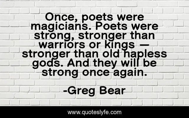 This page presents the quote "Once, poets were magicians. Poets were strong, stronger than warriors or kings — stronger than old hapless gods. And they will be strong once again.". Author of this quote is Greg Bear. This quote is about poets, poetry,.