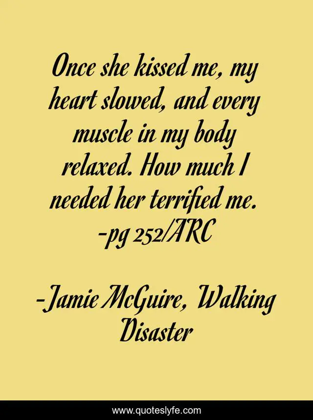 This page presents the quote "Once she kissed me, my heart slowed, and every muscle in my body relaxed. How much I needed her terrified me. -pg 252/ARC". Author of this quote is Jamie McGuire, Walking Disaster. This quote is about romance, kissing, tvavis-maddox,.