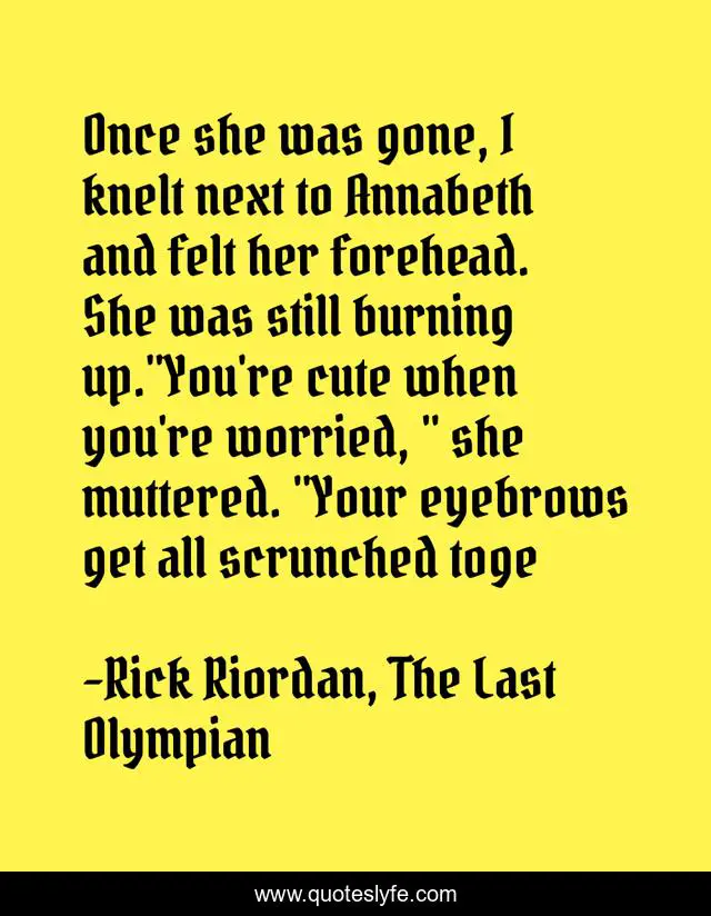 This page presents the quote "Once she was gone, I knelt next to Annabeth and felt her forehead. She was still burning up."You're cute when you're worried, " she muttered. "Your eyebrows get all scrunched toge". Author of this quote is Rick Riordan, The Last Olympian. This quote is about percy-jackson, favor, annabeth-chase, debt, friendship, knife,.