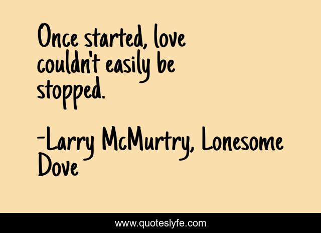 This page presents the quote "Once started, love couldn't easily be stopped.". Author of this quote is Larry McMurtry, Lonesome Dove. This quote is about love, thought, thought-to-ponder, not-easy, could-not-stop, affection,.