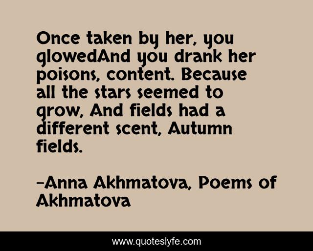 This page presents the quote "Once taken by her, you glowedAnd you drank her poisons, content. Because all the stars seemed to grow, And fields had a different scent, Autumn fields.". Author of this quote is Anna Akhmatova, Poems of Akhmatova. This quote is about love, poetry, affection, romantic,.