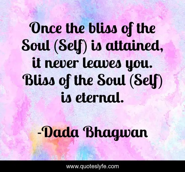 This page presents the quote "Once the bliss of the Soul (Self) is attained, it never leaves you. Bliss of the Soul (Self) is eternal.". Author of this quote is Dada Bhagwan. This quote is about eternal-bliss, spiritual, self-realised, eternal, self, self-realized, soul, knowledge-of-the-self, knowledge-of-self,.
