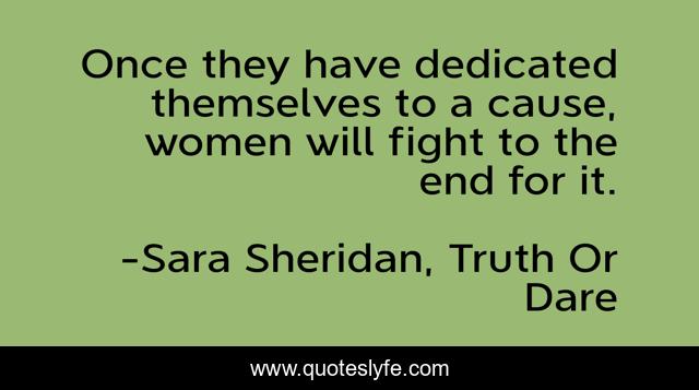 This page presents the quote "Once they have dedicated themselves to a cause, women will fight to the end for it.". Author of this quote is Sara Sheridan, Truth Or Dare. This quote is about fight, death, cause, women,.