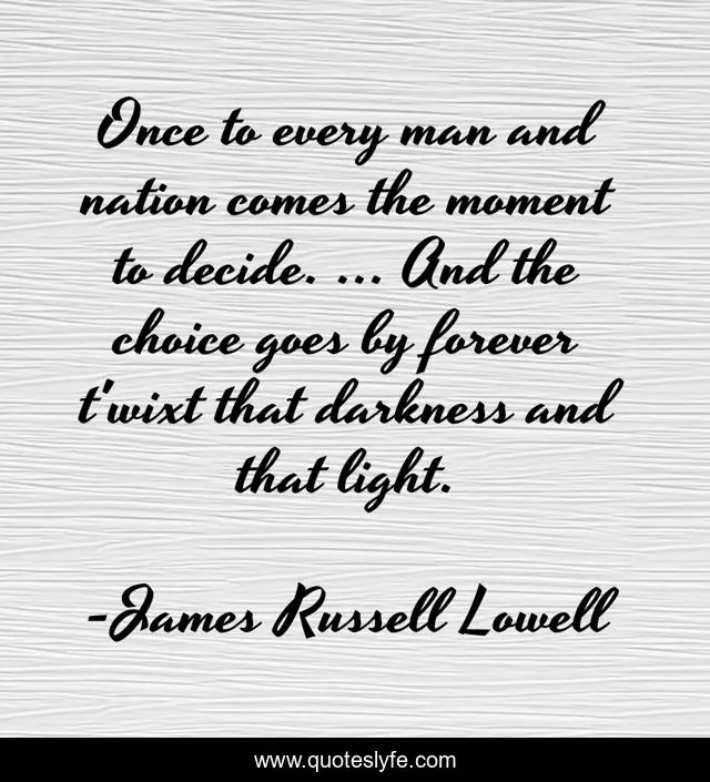 This page presents the quote "Once to every man and nation comes the moment to decide. ... And the choice goes by forever t'wixt that darkness and that light.". Author of this quote is James Russell Lowell. .