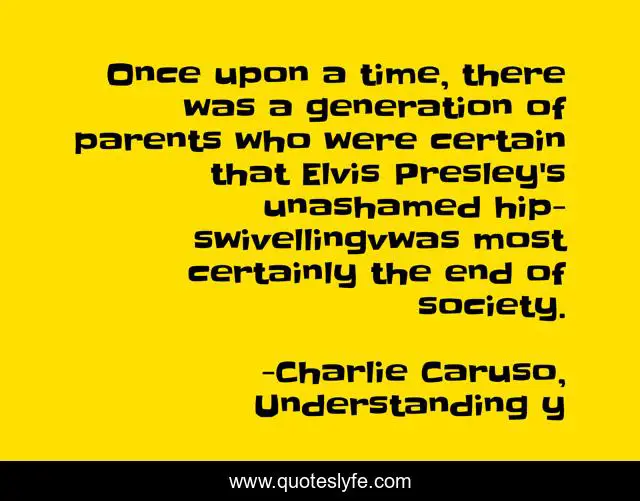 This page presents the quote "Once upon a time, there was a generation of parents who were certain that Elvis Presley's unashamed hip-swivellingvwas most certainly the end of society.". Author of this quote is Charlie Caruso, Understanding y. This quote is about geny, generation, elvis, parents, elvis-presley, generations,.