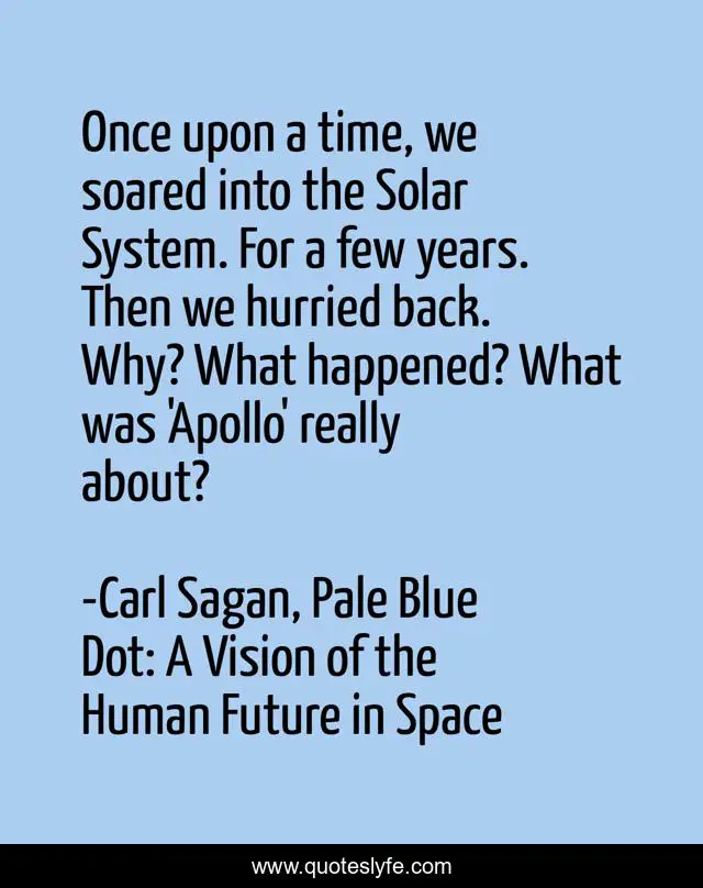 This page presents the quote "Once upon a time, we soared into the Solar System. For a few years. Then we hurried back. Why? What happened? What was 'Apollo' really about?". Author of this quote is Carl Sagan, Pale Blue Dot: A Vision of the Human Future in Space. This quote is about apollo, solar-system, exploration, space,.
