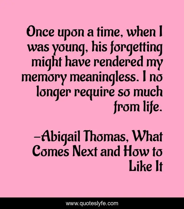 This page presents the quote "Once upon a time, when I was young, his forgetting might have rendered my memory meaningless. I no longer require so much from life.". Author of this quote is Abigail Thomas, What Comes Next and How to Like It. This quote is about age, meaning, growth, personal-development, life-philosophy, personal-development-insights,.