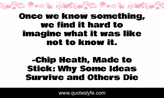 This page presents the quote "Once we know something, we find it hard to imagine what it was like not to know it.". Author of this quote is Chip Heath, Made to Stick: Why Some Ideas Survive and Others Die. This quote is about imagination, knowledge, forgetfullness,.
