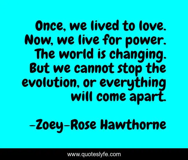 This page presents the quote "Once, we lived to love. Now, we live for power. The world is changing. But we cannot stop the evolution, or everything will come apart.". Author of this quote is Zoey-Rose Hawthorne. This quote is about enthusiasm, paranormal-romance, inspirational,.