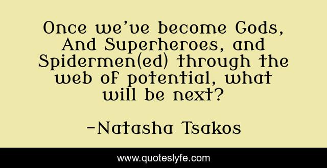 This page presents the quote "Once we’ve become Gods, And Superheroes, and Spidermen(ed) through the web of potential, what will be next?". Author of this quote is Natasha Tsakos. This quote is about super-heroes, future, curiosity, dreaming,.