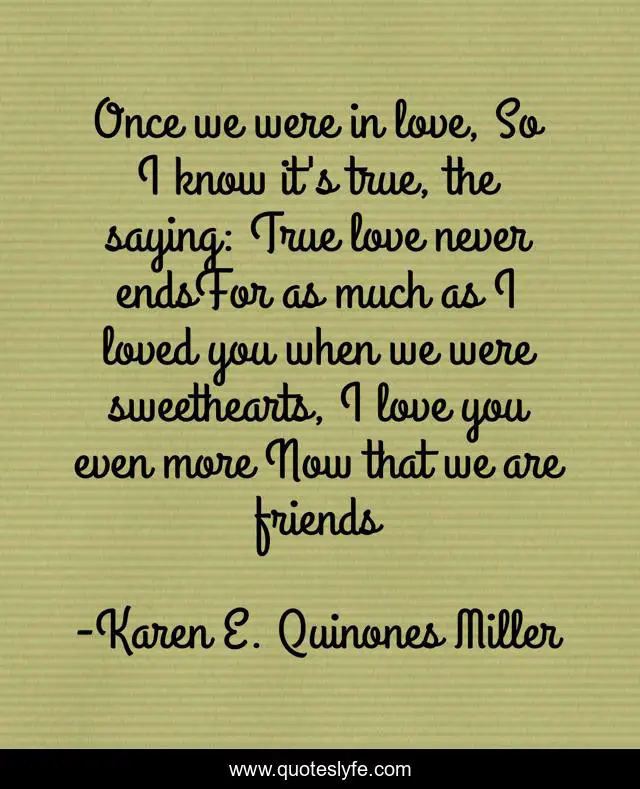 This page presents the quote "Once we were in love, So I know it's true, the saying: True love never endsFor as much as I loved you when we were sweethearts, I love you even more Now that we are friends". Author of this quote is Karen E. Quinones Miller. This quote is about lovers, lost-love, lovers-to-friends, poetry, wisdom, lovers-turn-to-friends, friendship, friends-and-lovers,.