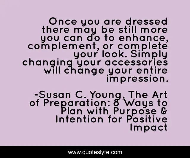 "Susan C. Young, The Art of Preparation: 8 Ways to Plan with Purpose & Intention for Positive Impact Quotes." Quoteslyfe.com, 2025. Fri. 05 Dec. 2025. <https://www.quoteslyfe.com/quote/Once-you-are-dressed-there-may-be-227454>.