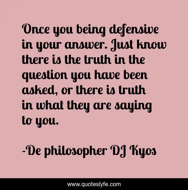 This page presents the quote "Once you being defensive in your answer. Just know there is the truth in the question you have been asked, or there is truth in what they are saying to you.". Author of this quote is De philosopher DJ Kyos. This quote is about motivation, philosophy, life-lessons, defensiveness, encouragement, quotes, truth, inspiration,.