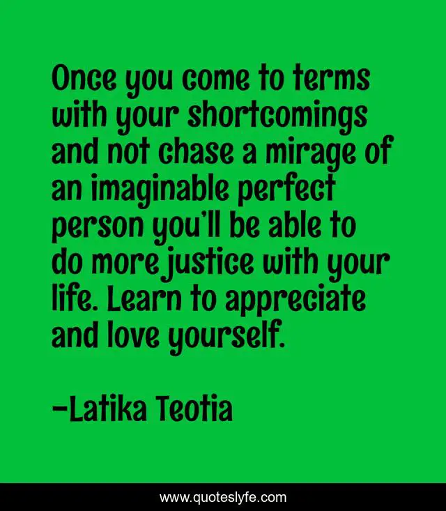 This page presents the quote "Once you come to terms with your shortcomings and not chase a mirage of an imaginable perfect person you’ll be able to do more justice with your life. Learn to appreciate and love yourself.". Author of this quote is Latika Teotia. This quote is about be-yourself, shortcomings, appreciate, life-lessons, love-yourself,.