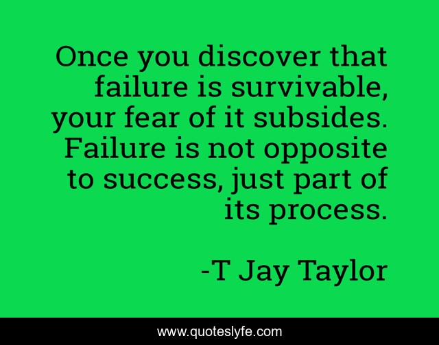 This page presents the quote "Once you discover that failure is survivable, your fear of it subsides. Failure is not opposite to success, just part of its process.". Author of this quote is T Jay Taylor. This quote is about failure, fear, survival, success, self-discovery,.