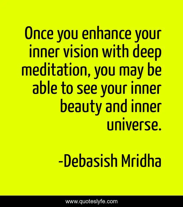 This page presents the quote "Once you enhance your inner vision with deep meditation, you may be able to see your inner beauty and inner universe.". Author of this quote is Debasish Mridha. This quote is about inner-beauty, deep-meditation, philosophy, debasish-mridha, inner-vision, inner-universe, quotes, debasish-mridha-md, inspirational,.