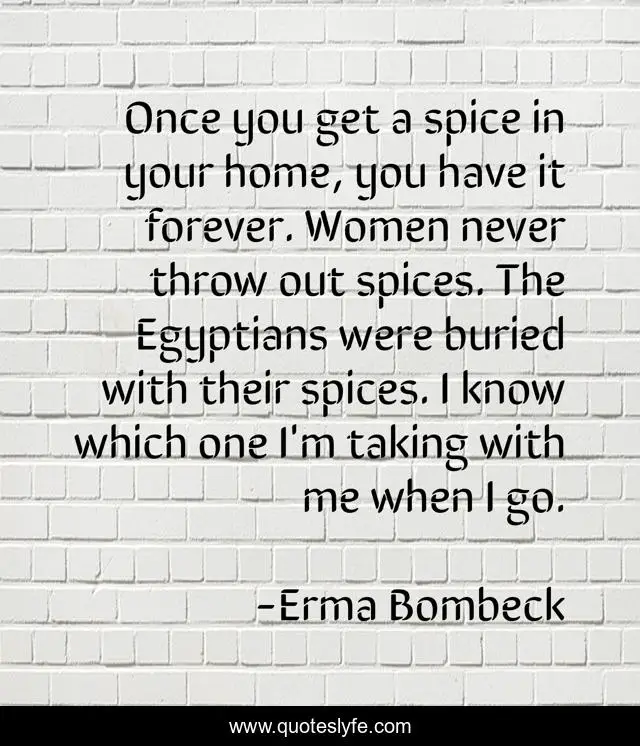 This page presents the quote "Once you get a spice in your home, you have it forever. Women never throw out spices. The Egyptians were buried with their spices. I know which one I'm taking with me when I go.". Author of this quote is Erma Bombeck. This quote is about me, home, women,.