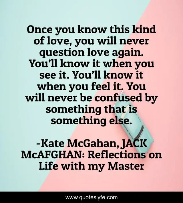 This page presents the quote "Once you know this kind of love, you will never question love again. You’ll know it when you see it. You’ll know it when you feel it. You will never be confused by something that is something else.". Author of this quote is Kate McGahan, JACK McAFGHAN: Reflections on Life with my Master. This quote is about sure, love, knowledge, certain, clear, definite, unconditional, unconditional-love, true,.