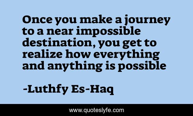 This page presents the quote "Once you make a journey to a near impossible destination, you get to realize how everything and anything is possible". Author of this quote is Luthfy Es-Haq. This quote is about achievement, enthusiasm, motivation, inspirational, success,.