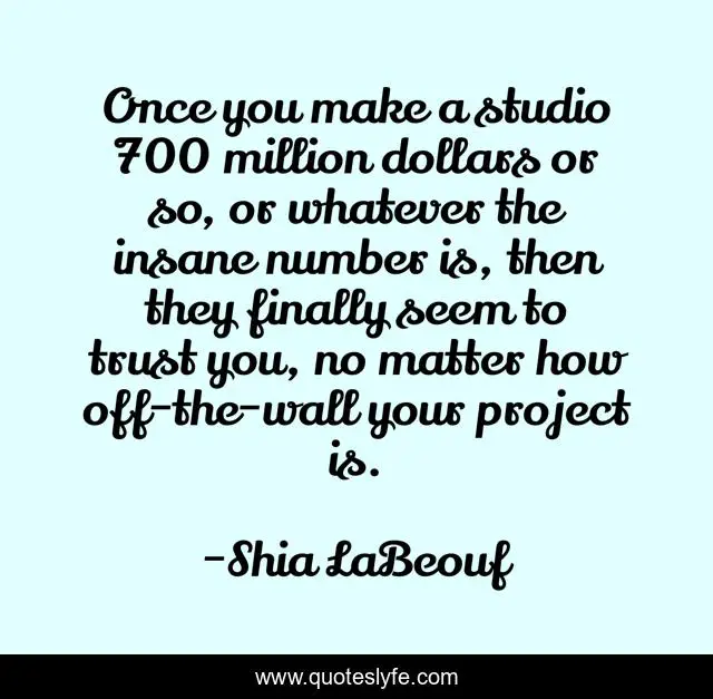 This page presents the quote "Once you make a studio 700 million dollars or so, or whatever the insane number is, then they finally seem to trust you, no matter how off-the-wall your project is.". Author of this quote is Shia LaBeouf. This quote is about insane, matter,.