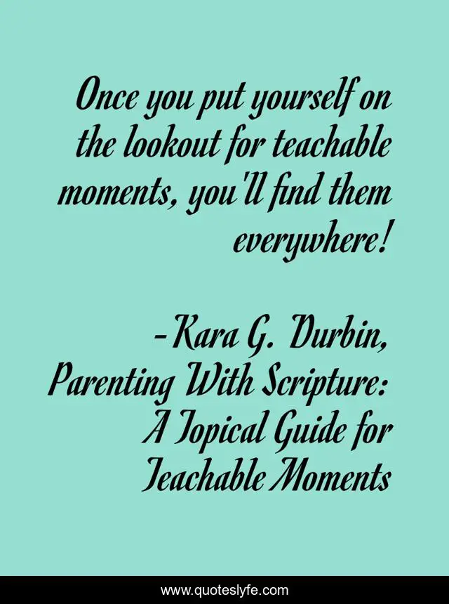 This page presents the quote "Once you put yourself on the lookout for teachable moments, you'll find them everywhere!". Author of this quote is Kara G. Durbin, Parenting With Scripture: A Topical Guide for Teachable Moments. This quote is about parenting, discipleship, education,.