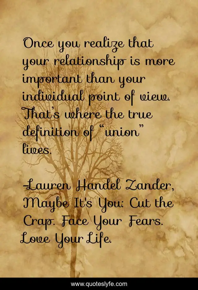 This page presents the quote "Once you realize that your relationship is more important than your individual point of view. That’s where the true definition of “union” lives.". Author of this quote is Lauren Handel Zander, Maybe It's You: Cut the Crap. Face Your Fears. Love Your Life.. This quote is about enthusiasm, relationship-advice, inspirational, self-help,.