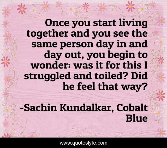 This page presents the quote "Once you start living together and you see the same person day in and day out, you begin to wonder: was it for this I struggled and toiled? Did he feel that way?". Author of this quote is Sachin Kundalkar, Cobalt Blue. This quote is about love, struggle, affection, feelings,.