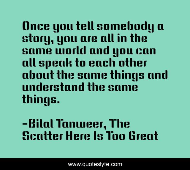 This page presents the quote "Once you tell somebody a story, you are all in the same world and you can all speak to each other about the same things and understand the same things.". Author of this quote is Bilal Tanweer, The Scatter Here Is Too Great. This quote is about stories, understanding-oneself-and-others, understanding-others,.