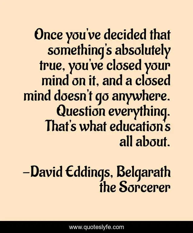 This page presents the quote "Once you've decided that something's absolutely true, you've closed your mind on it, and a closed mind doesn't go anywhere. Question everything. That's what education's all about.". Author of this quote is David Eddings, Belgarath the Sorcerer. This quote is about enthusiasm, education, inspirational,.