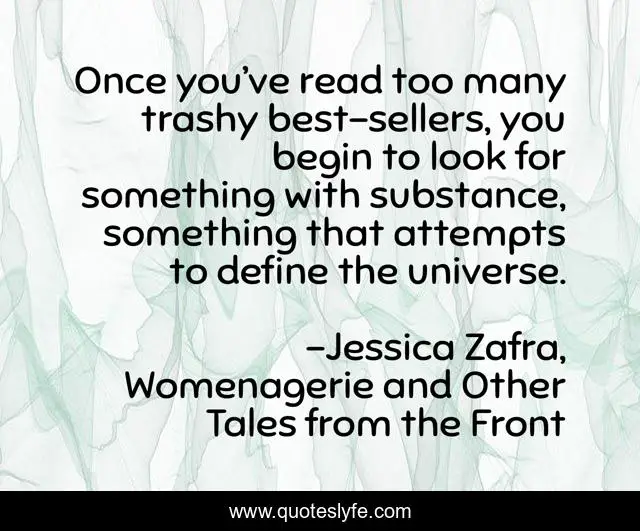 This page presents the quote "Once you’ve read too many trashy best-sellers, you begin to look for something with substance, something that attempts to define the universe.". Author of this quote is Jessica Zafra, Womenagerie and Other Tales from the Front. This quote is about substance, best-sellers, witty, books, truth, fact,.