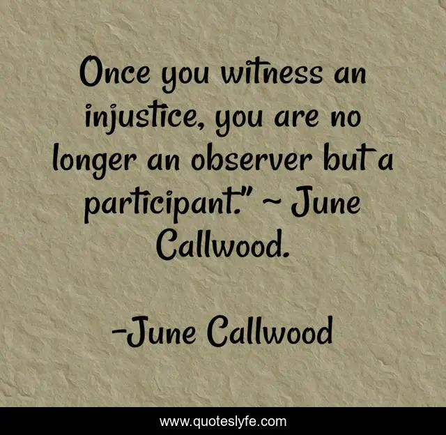This page presents the quote "Once you witness an injustice, you are no longer an observer but a participant.” ~ June Callwood.". Author of this quote is June Callwood. .