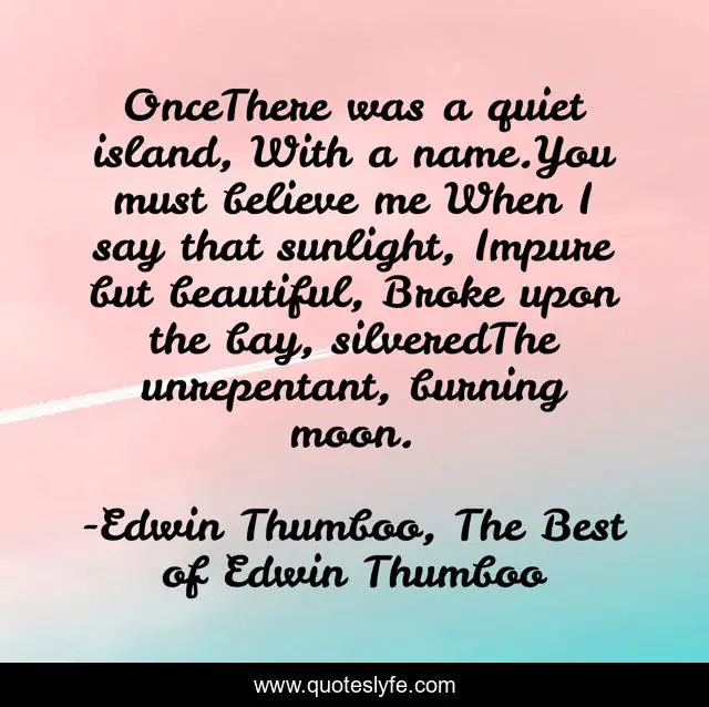 This page presents the quote "OnceThere was a quiet island, With a name.You must believe me When I say that sunlight, Impure but beautiful, Broke upon the bay, silveredThe unrepentant, burning moon.". Author of this quote is Edwin Thumboo, The Best of Edwin Thumboo. This quote is about poem, singapore, poetry, edwin-thumboo, singapore-poet, poet, singapore-pioneer-poet,.