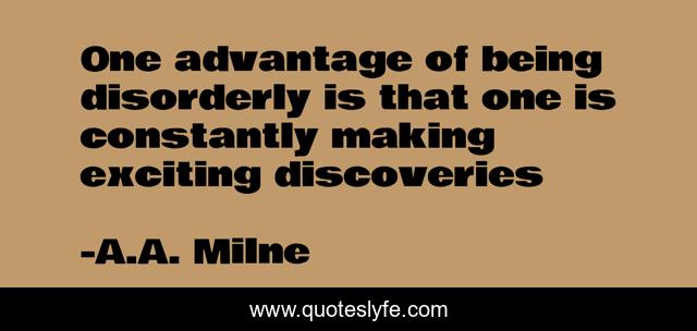 This page presents the quote "One advantage of being disorderly is that one is constantly making exciting discoveries". Author of this quote is A.A. Milne. This quote is about disorganised, winne-the-pooh, disorganisation, discovery,.