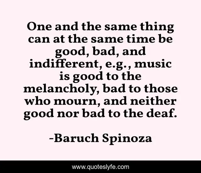 This page presents the quote "One and the same thing can at the same time be good, bad, and indifferent, e.g., music is good to the melancholy, bad to those who mourn, and neither good nor bad to the deaf.". Author of this quote is Baruch Spinoza. This quote is about good, deaf, time,.