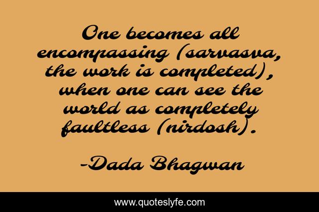This page presents the quote "One becomes all encompassing (sarvasva, the work is completed), when one can see the world as completely faultless (nirdosh).". Author of this quote is Dada Bhagwan. This quote is about world, completely, spiritual, faultless,.