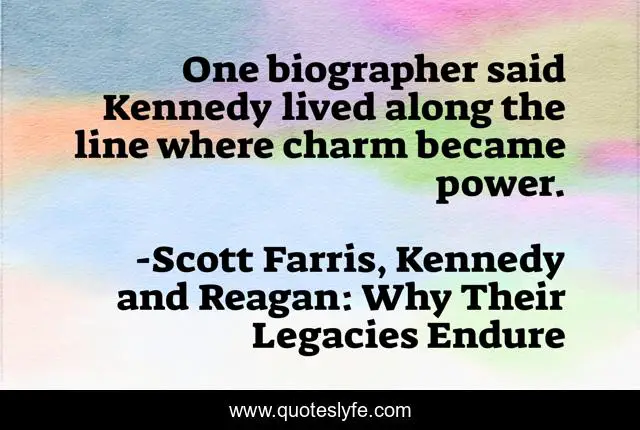 This page presents the quote "One biographer said Kennedy lived along the line where charm became power.". Author of this quote is Scott Farris, Kennedy and Reagan: Why Their Legacies Endure. This quote is about leadership, influence,.
