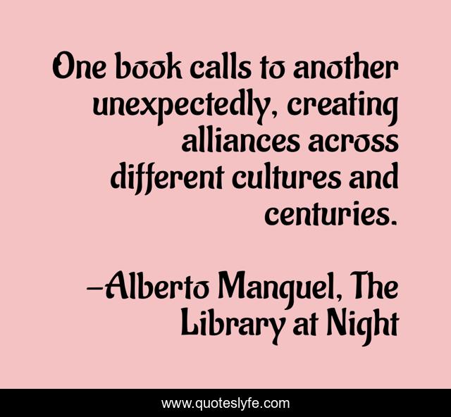 This page presents the quote "One book calls to another unexpectedly, creating alliances across different cultures and centuries.". Author of this quote is Alberto Manguel, The Library at Night. This quote is about culture, book, books,.
